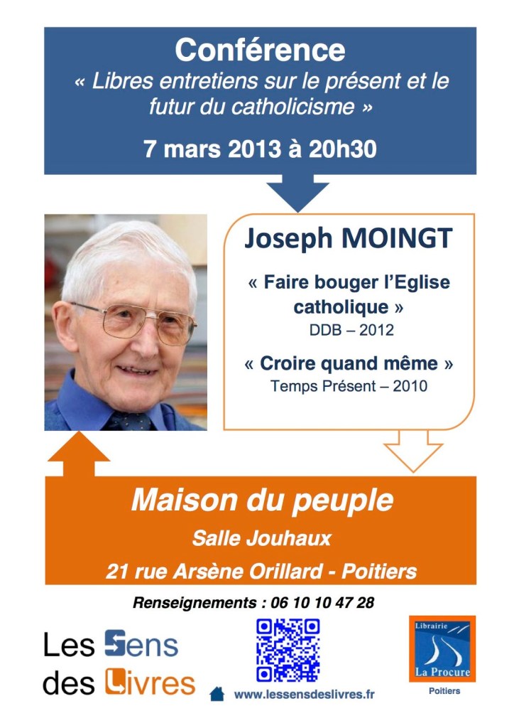 Au cours de cette conférence, Joseph MOINGT témoignera de l’espérance qui l’habite face aux questions troublantes pour l’Eglise Catholique : fuite des fidèles, tarissement du clergé, conflits d’autorité, mesures de restauration… Il s’appuiera sur deux de ses livres parus récemment : Croire quand même (2010) et Faire bouger l’Eglise Catholique (2012). C’est une chance pour tous les poitevins de rencontrer ce théologien de grand renom !