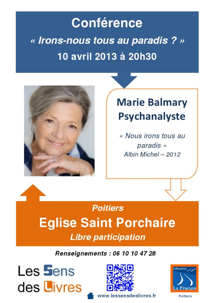 Nous vies seront-elles jugées dans l’Au-delà ? Cette question, comme tant d’autres, habitent nos existences. C’est Marie BALMARY qui tentera d’y répondre le mercredi 10 avril prochain à Poitiers (20h30 – Eglise St Porchaire). Pour donner un avant goût de cette conférence, vous pouvez regarder son intervention dans l’émission « L’esprit des lettres » (KTO – La procure).