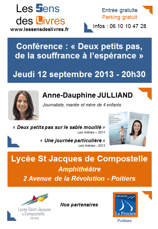 A travers ses témoignages, Anne-Dauphine JULLIAND apporte un message de vie, d’amour et d’espérance face aux épreuves que sont la maladie et la mort d’un enfant. Nous vous invitons à parcourir les articles de La Vie et La Croix ainsi que cette vidéo (extrait de l’émission « Allô docteurs » du 23/05/2013) pour la découvrir.