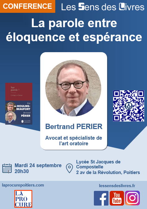Conférence / Dédicace gratuite « La parole entre éloquence et espérance » avec Bertrand PERIER, mardi 24 septembre 2024 à 20h30 au lycée Saint Jacques de Compostelle.