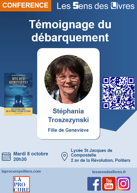 Conférence / Dédicace gratuite « Témoignage du débarquement » avec Stéphania Troszezynski, la fille de l’auteure, mardi 8 octobre 2024 à 20h30 au lycée Saint Jacques de Compostelle.