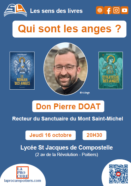 Conférence / Dédicace gratuite « Qui sont les anges » avec Don Pierre DOAT, recteur du Sanctuaire du Mont Saint-Michel, jeudi 16 octobre 2025 à 20h30 au lycée Saint Jacques de Compostelle à Poitiers.
