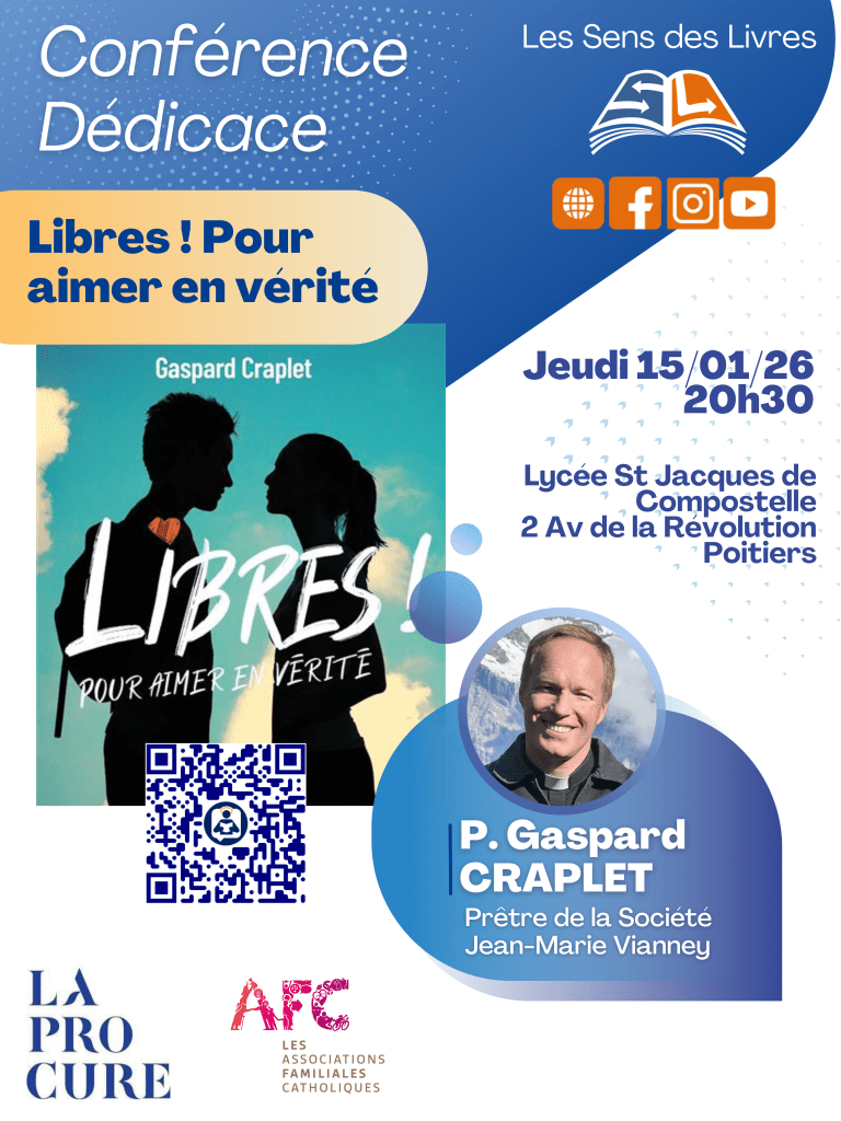Conférence/Dédicace gratuite « Libres ! Pour aimer en vérité » avec le Père Gaspard CRAPLET, prêtre de la Société Jean-Marie Vianney, jeudi 15 janvier 2026 à 20h30 au lycée Saint Jacques de Compostelle à Poitiers.